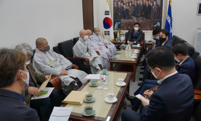 지난달 20일 오후 더불어민주당 당사를 방문한 대한불교조계종 대표단과 송영길 당대표와의 면담. 사진= 대한불교조계종 제공