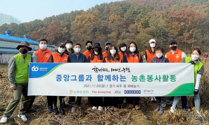 농협중앙회(회장 이성희) 지역사회공헌부는 5일 중앙그룹 임직원들과 함께 경기 파주 소재 콩 재배농가에서 수확철 '국민과 함께하는 농촌봉사활동'을 실시했다.