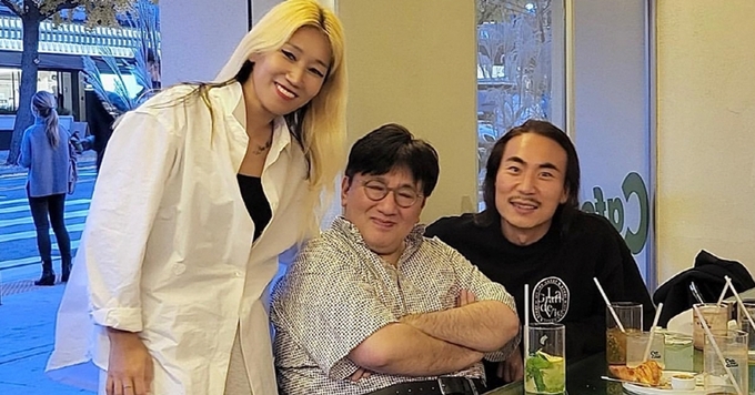 패션 디자이너 요니P(사진 왼쪽)가 방시혁 하이브 의장(〃 가운데)과의 우정을 과시했다.