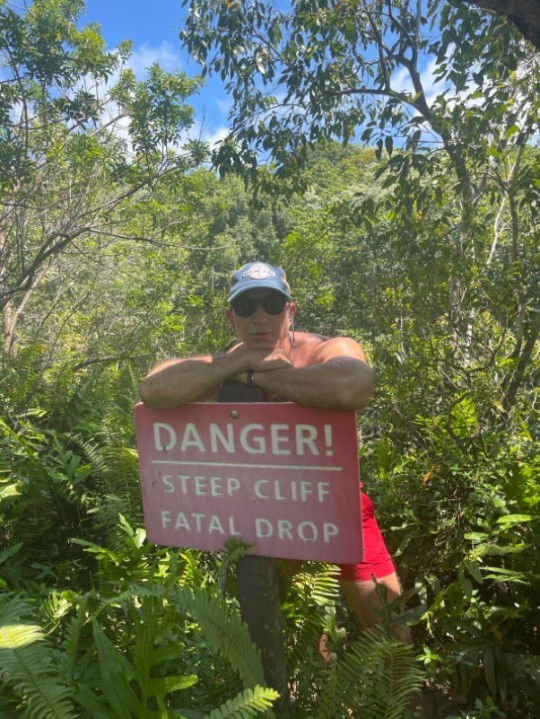 글과 함께 공개된 사진에는 ‘위험! 급경사 절벽 추락 주의’라는 푯말을 안고 있는 베조스의 모습이 담겨 있다.