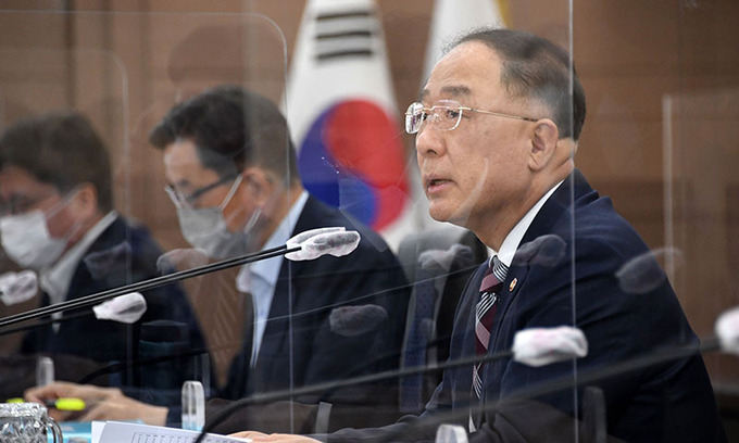 홍남기 경제부총리 겸 기획재정부 장관이 15일 오후 정부세종청사에서 열린 기획재정부 확대간부회의를 주재하고 있다. 기획재정부 제공