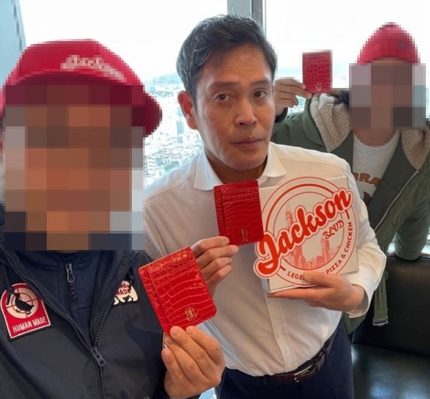 이어 정 부회장의 다른 손에는 빨간색 로고가 새겨진 ‘잭슨 피자’ 상자가 들려있다.