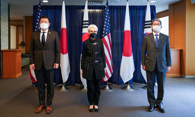 한·미·일 3국 고위 외교당국자들이 그제 미국 워싱턴에서 우리 정부가 추진 중인 종전선언 등과 관련해 공동기자회견을 가지려다 무산됐다. 회견장에는 최종건 1차관과 모리 다케오 사무차관 등 한·일 차관이 빠지고 웬디 셔먼 미 국무부 부장관 혼자 나왔다. 기자회견이 취소된 것이다. 전례없는 일이다. 최 차관은 “일본 측이 우리 경찰청장 독도방문 문제로 회견에 참석할 수 없다는 입장을 전달해 왔다”고 밝혔다. 일본이 급기야 속내를 드러낸 것이다. 한반도 이슈를 해결해야 할 우리 입장에선 의도치 않은 복병을 만난 것이나 다름없다.