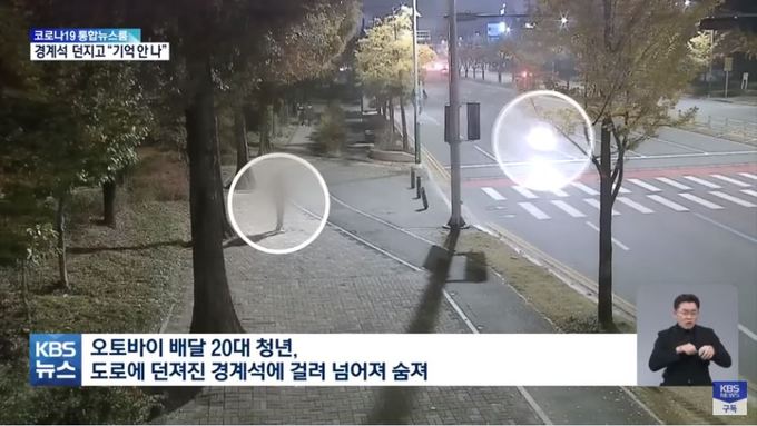 이후 5분쯤 지났을 때 새벽까지 오토바이로 음식을 배달하던 20대 청년이 경계석에 걸려 넘어지며 목숨을 잃었다.