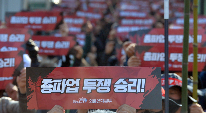 25일 전국민주노동조합연맹(민주노총) 공공운수노조 화물연대 포항, 경주지부 노조원 1700여 명은 이날 오전 10시 철강공단에서 총파업 출정식을 갖고 파업에 들어갔다.