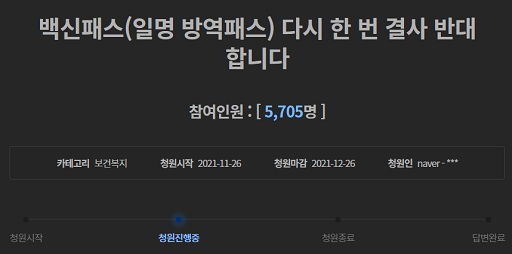 지난 26일 청와대 공식 홈페이지 국민청원 게시판에는 “백신패스(일명 방역패스) 다시 한 번 결사 반대합니다”라는 제목의 청원이 올라왔다.