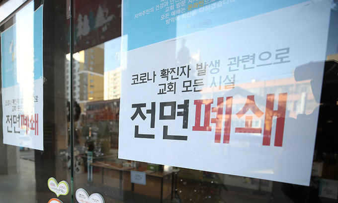 오미크론 변이 확산 우려가 일고 있는 인천 모 교회 출입문이 굳게 닫혀 있다. 연합뉴스