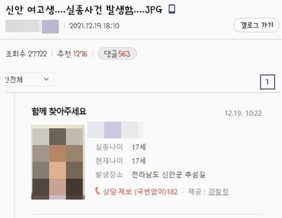 해당 게시글에는 전남 신안 추섬길에서 160㎝, 45㎏의 마른 체형에 교복 차림 17세 박모양이 연락이 두절됐다는 내용이 담겨 있다.