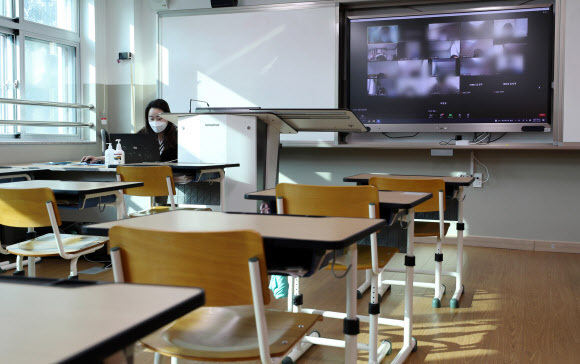 초중고교 등교수업과 원격수업이 병행 실시된 지난 20일 오전 세종시 한 중학교 1학년 교실에서 선생님이 원격수업을 하고 있다. 연합뉴스