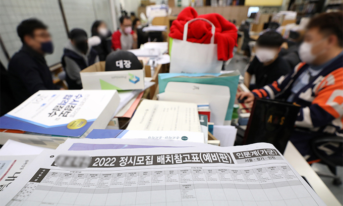 2022학년도 대학입시 정시모집 원서접수가 시작된 30일 서울 강남구 한 학원에서 학생들이 정시 지원 전략 상담을 받고 있다. 뉴시스