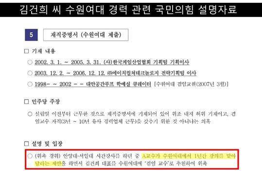민주당은 김씨 주장의 허위성을 입증할 근거로 수원여대가 국회에 제출한 자료를 제시했다. 해당 자료는 김씨 임용과 관련, 당시 채용방법은 ‘공개채용’이었다는 내용을 담고 있다.