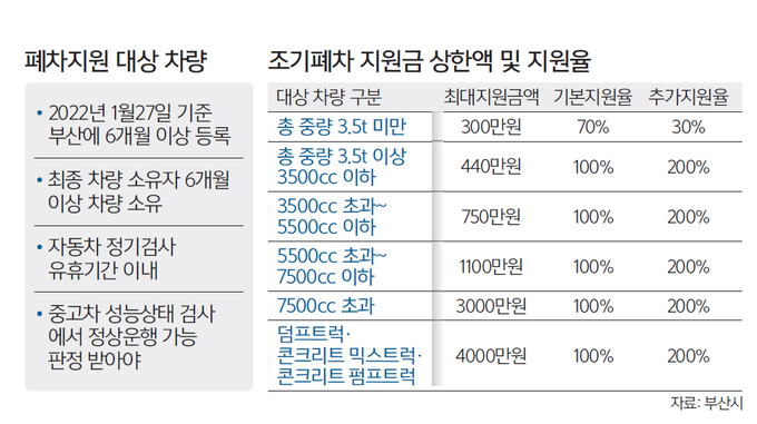 보조금 지원을 받기 위해서는 △접수 마감일 기준 부산시에 6개월 이상 등록 △6개월 이상 최종 소유자 차량 소유 △자동차 정기검사 유효기간 이내 △중고차 성능상태 검사 결과 정상 운행 가능 판정을 받아야 한다. 다만, 정부 지원을 통해 배출가스 저감장치를 부착하거나 저공해엔진으로 개조하면서 지원받았던 자동차는 이번 지원 대상에서 제외된다.