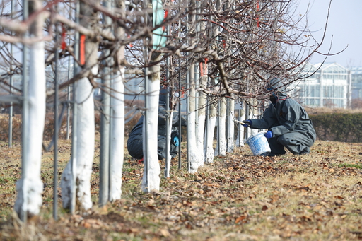 사과나무 얼지 않게 페인트 칠하기 입력 : 2022-01-11 01:05:00 수정 : 2022-01-10 18:29:58 농촌진흥청 제공 구글 네이버 유튜브 10일 전북 완주군 이서면 농촌진흥청 국립원예특작과학원 과수 시험재배지에서 직원들이 겨울철 언 피해를 예방하기 위해 사과나무에 흰색 수성 페인트를 칠하고 있다. 기자 Copyright ⓒ 세계일보. 무단 전재 및 재배포 금지 세계일보
