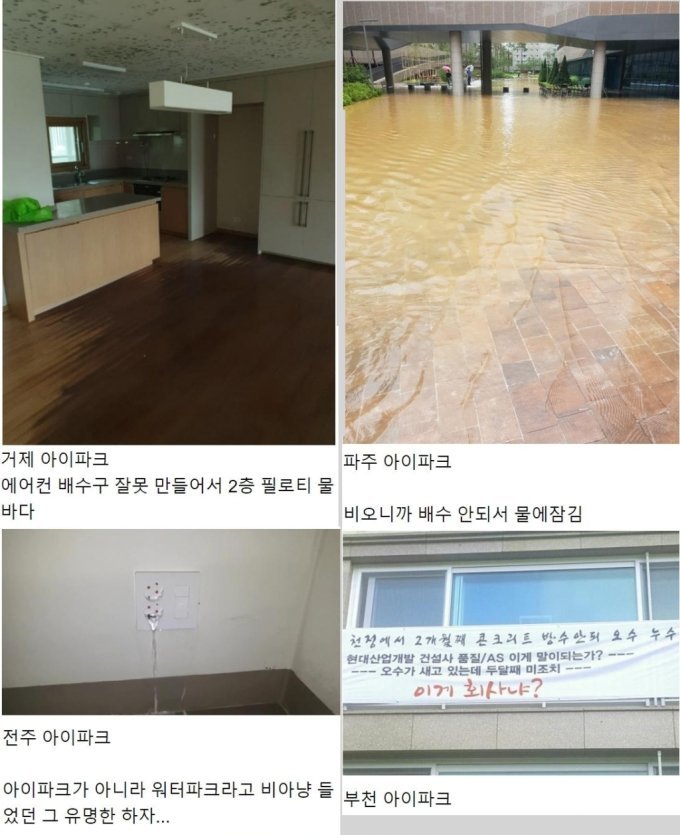 공개된 사진에는 에어컨 배수구 이상으로 물바다가 됐던 거제 아이파크, 전기 콘센트에서 물이 쏟아진 전주 아이파크, 배수가 안 돼 물에 잠긴 파주 아이파크, 콘크리트 방수 이상으로 천정에서 오수가 샌 부천 아이파크 등의 모습이 담겨 있다.