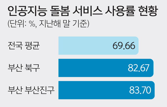 24일 SK행복나눔재단이 출연한 비영리법인 행복커넥트가 발표한 자료에 따르면 부산시의 AI 감성 케어 서비스가 전국 자치단체 평균 사용률보다 12%가량 높은 83%를 기록해 AI 스피커 사용률 전국 1위를 차지했다.