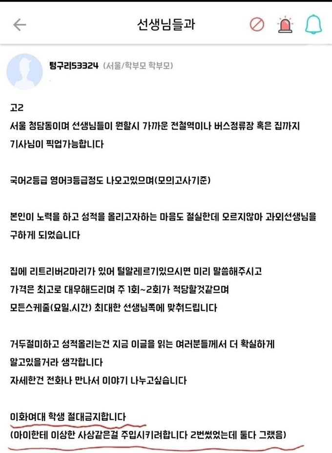그러나 A씨는 마지막 문단에서 “이화여대 학생 절대 금지한다“며 “아이에게 이상한 사상 같은 것을 주입시키려 한다. (과외 선생님을) 2번 썼었는데 둘 다 그랬다”며 특정 여대 학생들의 지원을 원천 봉쇄했다.