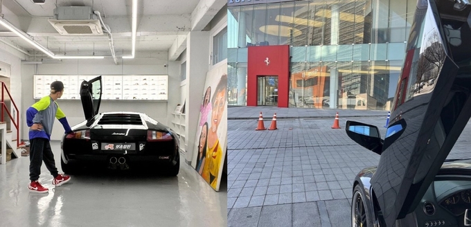 공개된 사진에는 자신의 슈퍼카 람보르기니를 탄 팝핀현준이 또 다른 슈퍼카 페라리 매장을 찾은 모습이 담겨 있다.