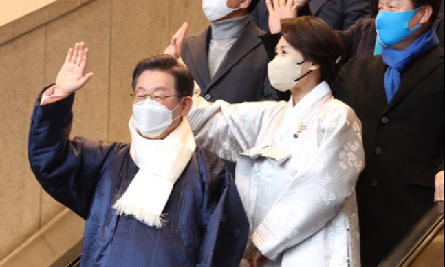 더불어민주당 이재명 대선후보가 설 연휴인 지난달 31일 부인 김혜경 씨와 함께 서울 용산역을 방문해 귀성 인사를 하고 있다. 더불어민주당 선대위 제공