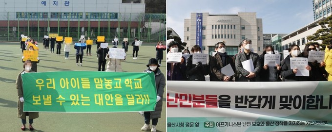 최근 아프가니스탄 특별기여자 가족 29가구가 정착을 위해 울산으로 이주한 가운데 9일 울산 동구 서부초등학교 학부모들이 학교 운동장에서 기여자 자녀들의 입학을 반대하는 피켓 시위를 벌이고 있다. 오른쪽 사진은 이날 기여자들의 울산 정착을 지지하는 시민사회단체 회원들이 울산시청 앞에서 환영 기자회견을 하고 있는 모습.