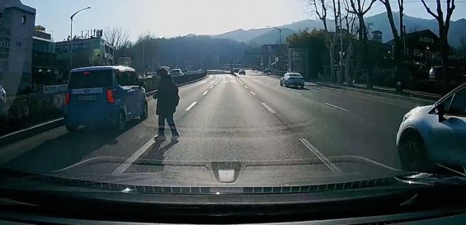한 보행자가 왕복 8차선 도로를 유유히 건넌 가운데 운전자가 당시의 영상을 공개했다.