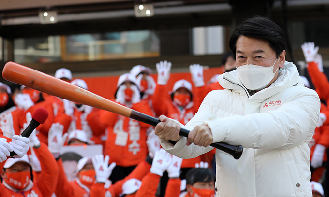 안 후보는 시장에서 한 70대 남성이 “(국민의힘) 윤석열 후보랑 합치면 안 되겠습니까”라고 묻자 “근데, 뭐 저러니까요”라며 야권 후보 단일화 결렬 책임을 윤 후보에게 돌렸다. 그러면서 “제가 경선하자고 제안했다. 그런데 (윤 후보가) 겁이 나서 도망쳤다. 오히려 (윤 후보가) 포기해주면 제가 정권교체하겠다”고 말했다.