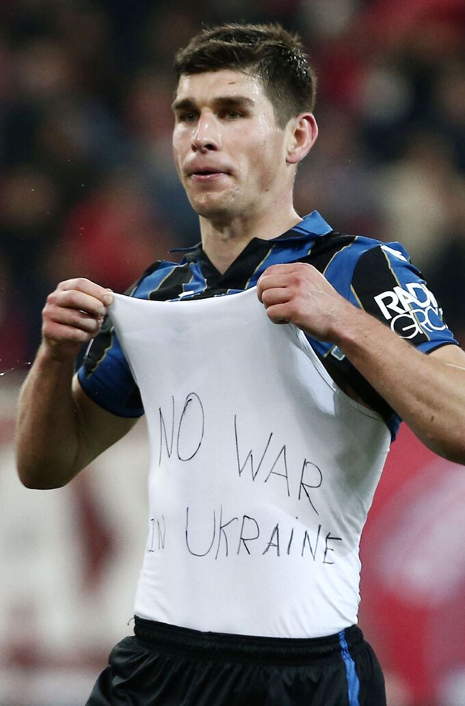우크라이나 선수들의 애 타는 '반전 메시지'는 이날도 계속됐다. 아탈란타(이탈리아)에서 뛰는 우크라이나 국가대표 루슬란 말리노코프스키는 이날 올림피아코스(그리스)와의 경기에서 2골을 넣고 팀의 3-0 승리를 끌어냈다. 그는 '우크라이나에 전쟁이 벌어져서는 안 된다'고 언더셔츠에 쓴 메시지를 내보이고 기도하듯 두 손을 모으는 세리머니를 펼쳤다.