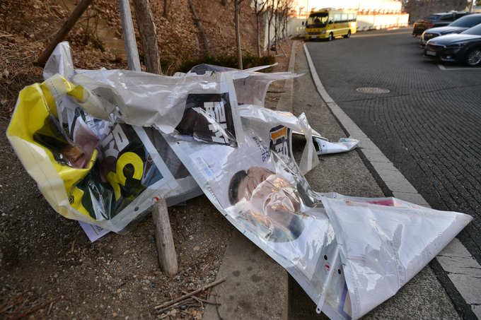 지난 2월28일 서울 중구의 한 도로에 선거벽보가 훼손된 채 방치돼 있다. 뉴스1