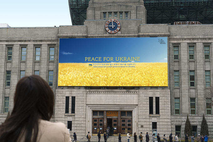 중앙에는 ‘우크라이나 땅에 하루 빨리 평화가 깃들기를 기원합니다(PEACE FOR UKRAINE)’라는 문구가 담겼다. 평화의 상징인 비둘기와 함께 서울시가 우크라이나와 함께한다는 메시지(SEOUL STANDS WITH UKRAINE)도 우측 상단에 추가했다.