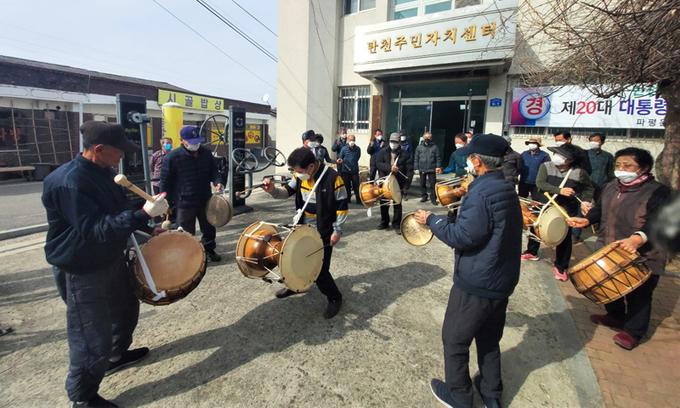 충남 공주시 탄천면 삼각리 탄천복지회관서 지난 10일 마을 주민들이 꽹과리와 장구, 북을 치며 윤석열 당선 축하잔치를 벌였다.