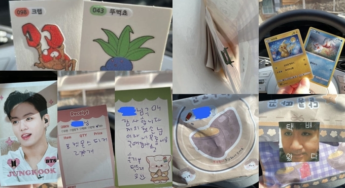 이와 함께 공개된 사진에는 아이들로부터 받은 물품의 모습이 담겨 있다. 특히 각종 스티커로 꾸며진 봉투 안에는 주스와 각종 사탕, 포켓몬 카드와 BTS 정국의 포토 카드, 여러 장의 스티커, 딸기 모양 지우개 등이 가득 자리해 눈길을 끌었다. 또 아이들은 메모장에 서툰 글씨로 “구매 감사합니다. 저의 첫 손님이라 너무 좋네요. 구매 감사하고 후기 부탁드려요”라는 내용도 담았다.