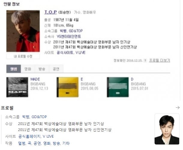지난 7일 빅뱅의 컴백 소식과 함께 빅뱅 멤버 탑(본명 최승현)의 전속 계약 종료 소식이 알려진 가운데 포털 사이트에서 탑의 프로필 사진이 변경됐다.