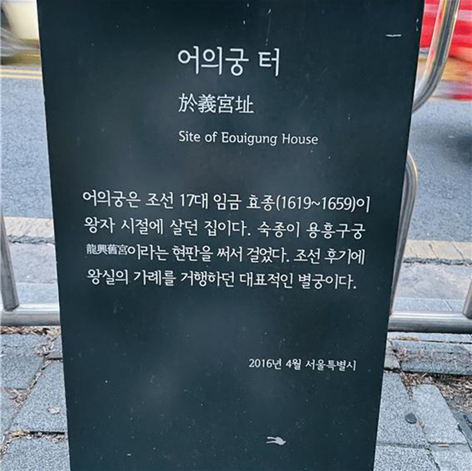 코로나19의 위세 속에서도 어김없이 봄은 찾아온다. 봄이 되니 주변에 결혼식을 알리는 소식도 전해진다. 조선시대 왕실 결혼식에는 여섯 가지 예법이 있었다. 납채(청혼서 보내기), 납징(함 보내기), 고기(날짜 잡기), 책비(왕비 책봉), 친영(친히 왕비를 맞이하러 감), 동뢰(궁궐에서 함께 술잔을 나눔)가 그것이다. 이 중에서 가장 중요한 의식은 친영(親迎)으로 오늘날 예식장에서 거행되는 결혼식 장면과 유사하다. 조선시대 왕실 사람은 10대 초반에 혼인해 대부분 세자 지위에서 세자빈을 맞이했다. 왕이 혼인하는 경우엔 계비를 맞이할 때가 많았다. 왕비로 간택되면 별궁(別宮)에서 미리 왕비 수업을 받게 했다. 조선시대 별궁으로 가장 많이 활용된 곳은 효종의 잠저(왕이 되기 전에 살았던 곳)인 어의궁(於義宮)이었다. 19세기 서울의 연혁과 관청, 풍속 등을 기록한 ‘한경지략’에는 “상어의궁은 인조의 잠저인데 잠룡(潛龍)이라는 이름의 연못이 있고, 용흥궁은 동부 숭교방에 있는데 보통 하어의궁(下於義宮)이라고 한다”라고 기록돼 있다. 조선 후기에 오면 어의궁은 곧 하어의궁을 지칭했고, 어의동별궁 또는 어의동본궁이라고도 했다. 1681년 5월 숙종과 계비 인현왕후, 1759년 6월 영조와 계비 정순왕후, 1851년 9월 철종과 철인왕후의 혼례식이 어의궁에서 거행됐다. 영조실록에는 1759년(영조 35) 6월22일 “임금이 어의궁에 나아가 친영례를 거행했다”는 기록이 보인다. 어의궁 위치는 현재 서울 종로구 대학로에 위치한 효제초등학교 인근으로 보고 있다. 지하철 4호선 혜화역 3번 출구에서 종로5가역 방향으로 가면 ‘어의궁터’라는 표지석이 설치돼 있다. 어의궁이 별궁으로 활용된 것은 이곳이 창덕궁, 창경궁 등 궁궐과 가까웠기 때문이었다. 1863년 고종과 명성황후의 혼례가 흥선대원군 사저였던 운현궁에서 거행되면서 어의궁을 혼례식장으로 활용한 역사는 그 막을 내리게 된다.