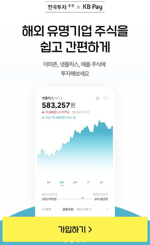 서비스 이용을 희망하는 KB국민카드 고객은 KB Pay 앱 접속 후 더보기→편의기능→‘한국투자증권 해외주식투자’→본인인증→계좌 선택→동의→신분증 확인→계좌 1원 인증 과정을 거치면 된다. 이후 고객정보 확인과 투자성향 확인, 주식계좌 비밀번호 설정을 하면 가입이 완료된다. 현재 KB국민카드는 서비스 신규가입 고객을 대상으로 경품 추첨 및 최대 7000원 상당의 인기 해외주식 종목 제공 행사를 진행하고 있다.