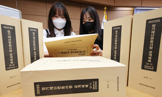 인사혁신처 관계자들이 30일 정부세종청사에서 22년 고위공직자 1978명의 정기 재산변동사항 신고 내용을 살펴보고 있다. 정부공직자윤리위원회 관할 공개대상자는 행정부 소속의 정무직, 고위공무원단 가 등급, 국립대학 총장, 공직유관 단체장, 광역·기초 지방자치단체장, 광역의회 의원, 시·도 교육감 등이다. 세종=연합뉴스
