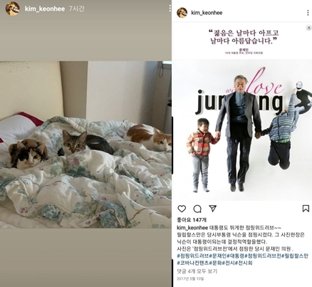 김 여사는 이날 인스타그램 스토리를 통해 윤 당선인과 자택에서 키우는 고양이 세 마리가 침대 위에 올라가 있는 사진을 올렸다.