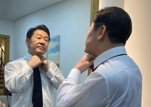 사진에는 안경을 벗은 채 ‘흑발’로 염색하고 남색 넥타이를 매며 미소를 짓는 이 상임고문의 모습이 담겼다.
