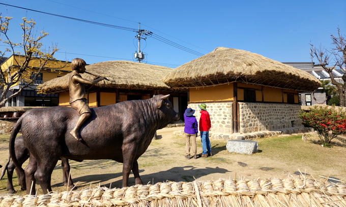 옥천 시인의 생가 앞마당 황소 타고 피리 부는 소년상/담장엔 봄꽃들 소곤소곤/가는 곳마다 시인 작품 감상/골목길 담벼락에도 ‘향수’ 부르는 글과 그림