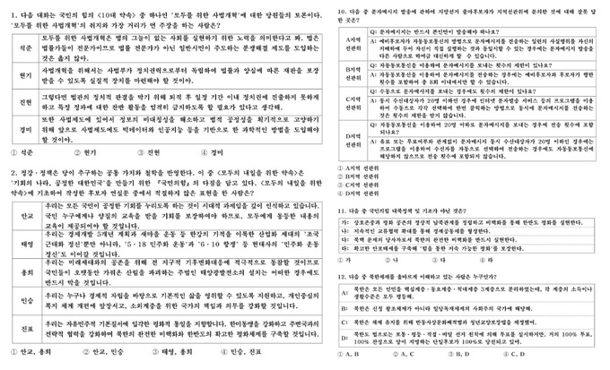 선거운동에 해당하는 행위를 고르거나, 국민의힘의 대북정책 및 기조가 아닌 것을 고르고, 보건복지부 전국아동학대현황고보서를 보고서 나눈 당원의 대화 중 적절하지 않은 것을 고르는 방식 등이다.