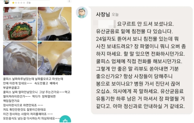 이에 쿨피스를 제공한 식당 사장은 후기를 작성한 이에게 답글을 통해 병원에 가보라면서 “요구르트 안 드셔 봤나”라고 물었다.