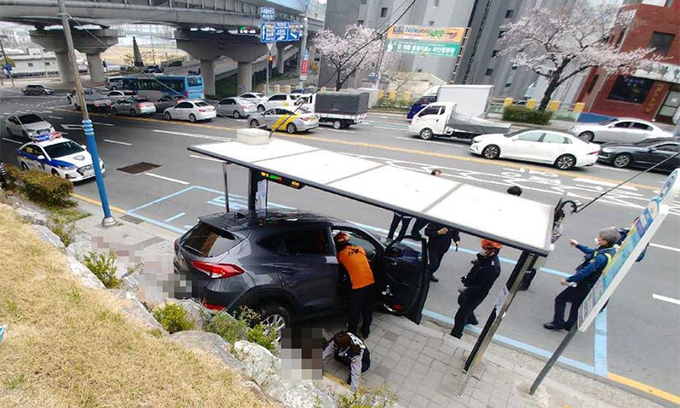 A씨는 지난달 30일 오후 2시 39분쯤 부산 서구 암남동 주민센터 주차장에 자신의 투싼 차량을 주차하려다 한차례 주차장 담벼락을 들이받은 뒤, 후진으로 30여 m를 달려 버스 정류장을 덮쳤다.