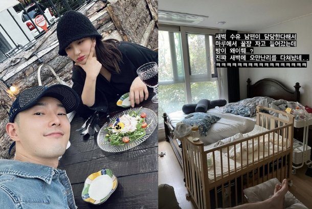 11일 자이언트핑크는 인스타그램 스토리에 “새벽 수유 남편이 담당한다고 해서 마루에서 꿀잠자고 들어갔는데 방이 왜 이래...? 진짜 새벽에 난리를 다 쳐놨네...”라는 글과 사진을 게재했다.