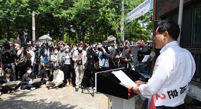 오세훈 서울시장이 12일 서울 구로구 고척동에서 서울시장 선거 출마를 선언하고 있다. 국회사진기자단
