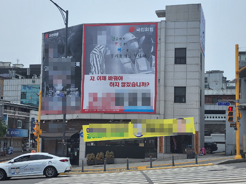사전협의 없이… 영어학원 건물 대형 현수막으로 가린 국힘 시의원 후보