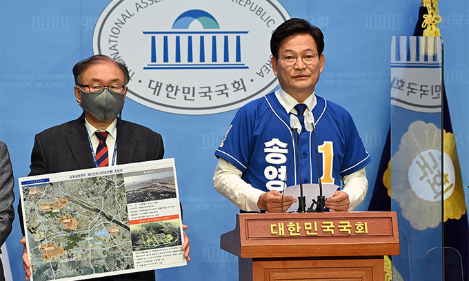 반면 송 후보와 맞붙는 국민의힘 오세훈 서울시장 후보는 이날 자당 김은혜 경기지사 후보, 허향진 제주지사 후보와 함께 김포공항에서 김포공항 이전 저지를 위한 공동 기자회견을 열고 “급조된 두 후보(송 후보와 이 후보)의 졸속공약”이라고 일갈했다.