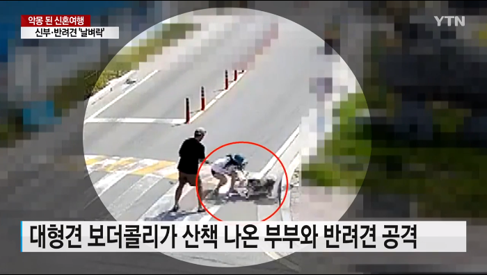 강원도로 신혼 여행을 갔던 부부가 강아지와 함께 산책하던 중 보더콜리에게 물림 사고를 당했다.