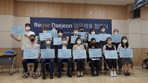 프로젝트 시행에 앞서 사회혁신센터는 이날 대전평생교육진흥원 1층에서 프로젝트에 동참하는 대전시자활센터, 대전창조경제혁신센터, 대전테크노파크, 하나은행 등 11개 기관·단체, 중구 선화동 소재 9개 카페와 ‘리유즈 대전(Reuse Daejeon)’ 업무협약식을 가졌다.