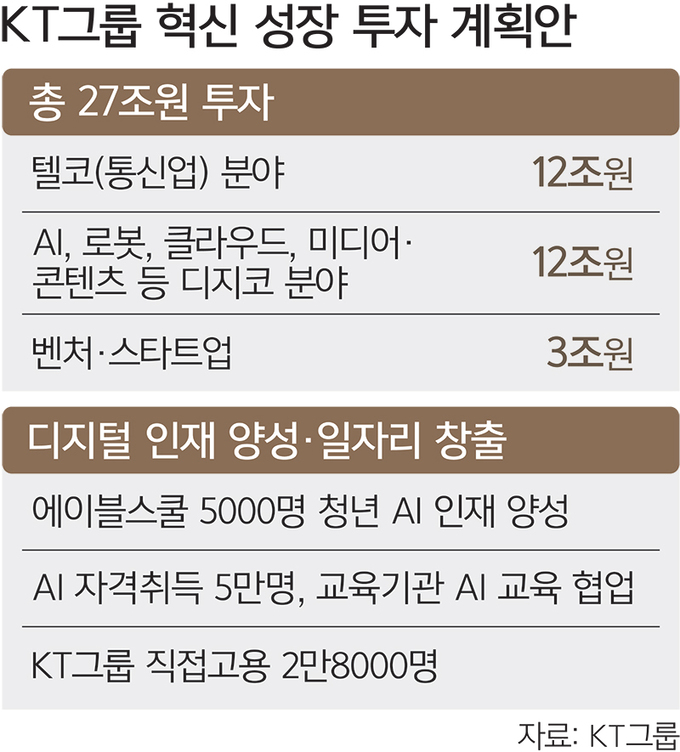 KT가 네트워크, 디지털플랫폼(DIGICO·디지코), 벤처·스타트업 분야의 육성을 위해 5년간 27조원을 투자한다. 이는 KT그룹 출범 이후 발표한 투자액 규모로는 역대 최대다. 또 5년간 2만8000명을 직접 고용하고, 투자액과 별개로 6조원 규모의 콘텐츠를 확보하며 미디어 생태계 발전을 이끈다. 공격적인 투자로 ‘디지코’ 혁신 성장세를 이어 가겠다는 전략이다.