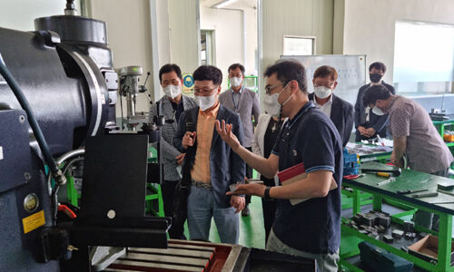 부산교육감직 인수위가 22일 부산공고를 찾아 학교 관계자로부터 실습현장에 대한 설명을 듣고 있다. 부산교육감직 인수위 제공