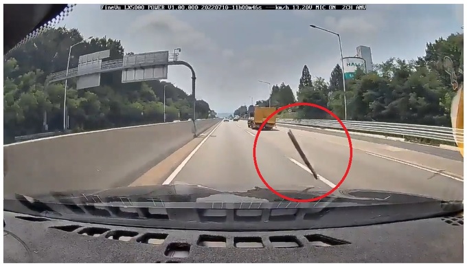 가족을 태우고 고속도로를 달리던 승용차에 판스프링이 날아든 아찔한 사고가 발생했다. 판스프링은 화물차 바퀴의 충격완화 장치지만, 도로에 떨어지면 교통안전을 위협하는 매우 위험한 흉기가 된다.