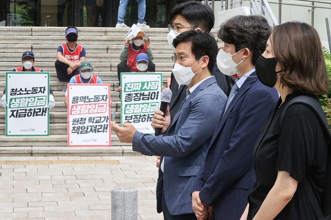 더불어민주당 당권주자인 이재명 상임고문은 이날 연세대학교 청소 노동자들을 만나 “최소한의 인간다운 대우와 처우, 보상을 받을 수 있어야 한다”고 말했다. 이 고문은 노동자들과 간담회에서 “쾌적한 환경에서 노동하는 것도 노동자의 권리인데 화장실 앞 창고를 (노조) 사무실로 쓰고 계시다”며 “그 점도 참 안타까웠다”고 했다.